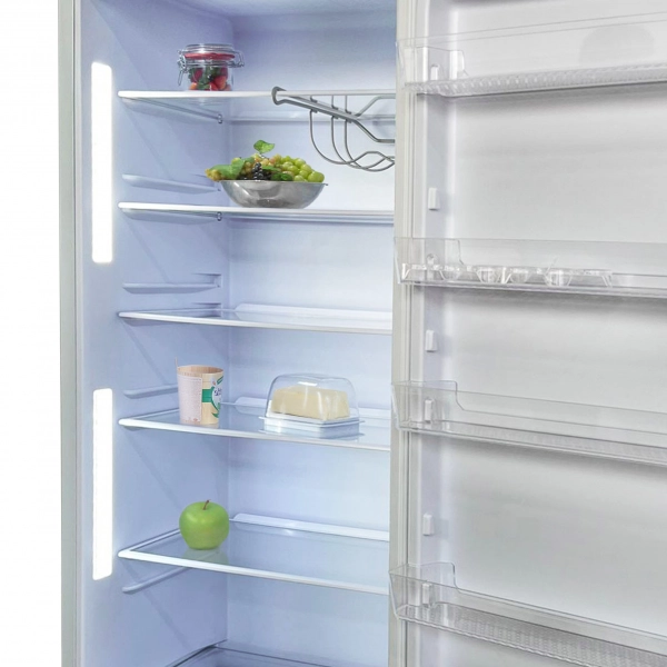- LED‑подсветка. Два вертикальных светильника обеспечивают яркое и равномерное освещение всего объёма, позволяя быстро найти нужный продукт.